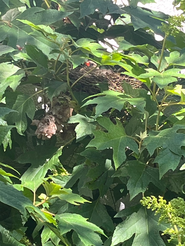 In mid-May, I watched the female cardinal begin to build a nest in my sprawling oakleaf hydrangea.